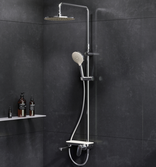 Тотальный дизайн в действии: все детали душевой системы – от пропорций ручного и верхнего душей до рисунка расположения форсунок на лейках.Премиальные размеры и продуманные детали: увеличенный диаметр душевых леек (верхний душ 254 мм и ручной душ 120 мм) позволит ощутить преимущества тропического душа, тогда как увеличенная длина шланга 1750 мм обеспечит свободу движений во время принятия душа. Телескопическая поворотная штанга регулируется по высоте в диапазоне от 1030 до 1460 мм, обеспечивая комфорт для людей любого роста, а шаровой шарнир в держателе верхнего душа позволяет регулировать угол его наклона.Смеситель выполнен в виде полочки. Чистый дизайн без лишних деталей: переключатель расположен за ручкой настройки температуры и позволяет менять источник потока воды от ручной лейки и излива до верхнего душа.