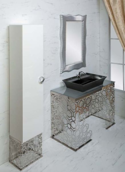 Консоль с раковиной Aura шириной 110 см цветом хромКонсоли произведены из нержавеющей стали благодаря чему стойки к коррозии. Гальваническое покрытие исполнено в цветах хром и золото. Можно выбрать столешницу из мрамора, хрустального каленого стекла в различных цветовых исполнениях, и Solid Glass (передовой материал, в состав которого входит мраморная крошка и стекло). Раковины-чаши выполнены из Corian, которыми можно дополнть консоли, хрустального стекла, керамики. Хорошим дополнением к консолям являются пеналы ArmadiArt, а также сифоны, клик-клаки и смесители Boheme.Мебель можно дополнить пеналом и зеркалом