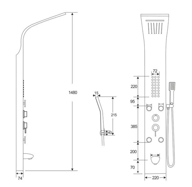 - Комплектация: душевая панель, душевая лейка, смеситель, шланг для душа, верхний душ, крепеж, инструкция