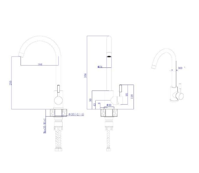 Смеситель для кухни с высоким поворотным изливом RUSH Melos арт. SUS1101-22 с металлической ручкой изготовлен из нержавеющей стали SUS304 и имеет рычажное управление. В смеситель установлен картридж D-35 с керамическими пластинами. Высота смесителя 356мм. Излив поворотный 184мм. Высота излива до аэратора 255мм. Аэратор изготовлен из пластика с нержавеющим корпусом, угол наклона аэратора- 7 гр. В комплекте гибкая подводка с гайками 40 см - 2шт, универсальная присоединительная группа, фум-лента, индивидуальный пакет, паспорт, гарантийный талон.