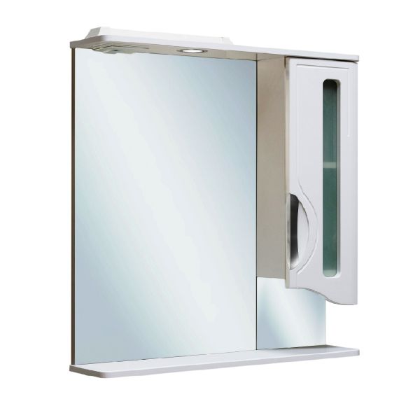 Зеркальный шкаф оборудован одним врезным светодиодным светильником 220В и розеткой с выключателем. Справа - шкафчик с распашным фасадом со стеклянной вставкой. Внутри - одна встроенная полочка. Петли со встроенным доводчиком, ручка врезная- 1шт. Выпускается только в правом исполнении.