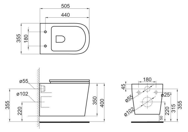 • Прилегание унитаза к стене:
